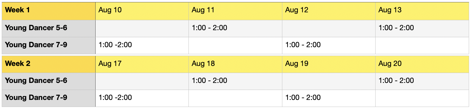 This intensive week meets Monday through Thursday for 1.5 hours each day. It offers dancers a focused opportunity to get a head start on the year ahead, establish goals, and reinforce strong training habits. The program is open to dancers enrolled in Middle School Levels 2A and 2B during the 2025–26 Annual Season.