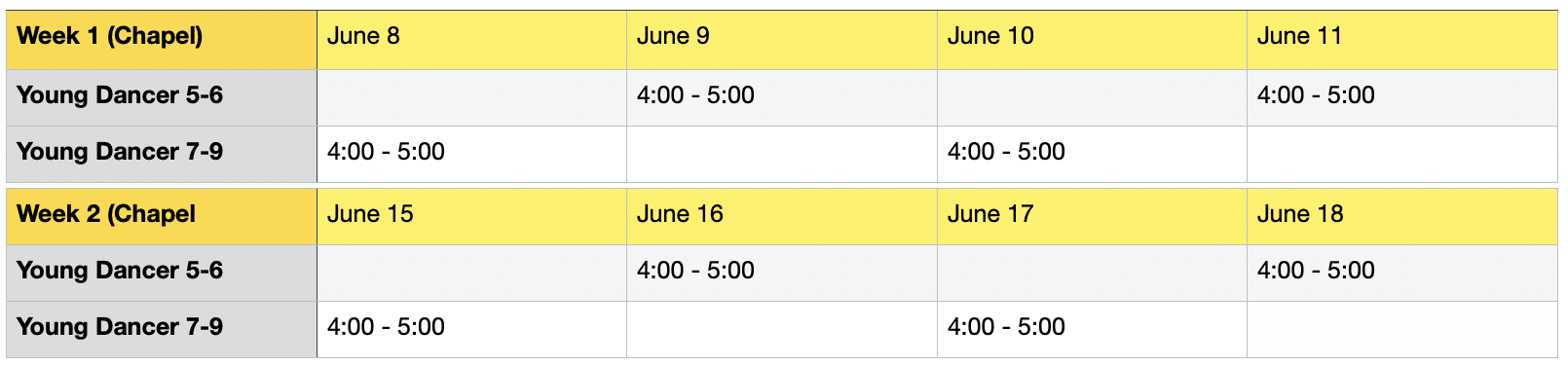 This level meets at our Chapel location and is designed for advanced pointe dancers. Classes meet four times per week for 2.5 hours each day. Each day includes a 1.5 hour technique class, along with 1 hour of supplementary training. Supplementary classes may include pointe, variations, contemporary, character, conditioning, and more.